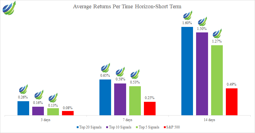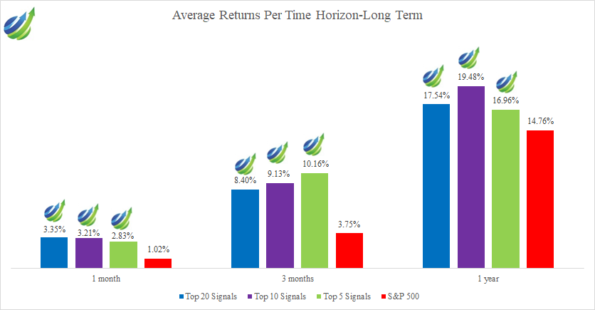 • The highest average return is 26.1% for the Top 10 Signals on a 1-year time horizon.