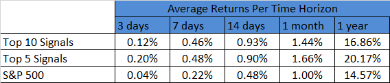 - The highest average return is 20.17% for the Top 5 Signals on a 1-year time horizon.