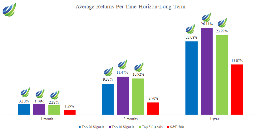 • The highest average return is 26.1% for the Top 10 Signals on a 1-year time horizon.