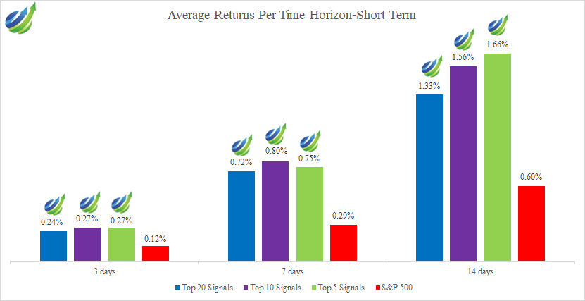 • The highest short-term average return is 5.39% for the Top 5 Signals on a 14-day time horizon.