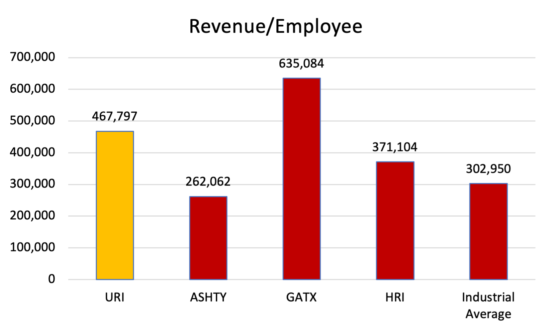 According to WSJ, URI has an annual Gross Margin of 33.20%, higher than Ashtead Group plc (ASHTY), Herc Holdings Inc (HRI), and the industry average by nearly 10%, but lower than GATX Corp (GATX) by 7.67%. A relatively high operating margin implies URI makes more money from its ongoing operations to pay for costs. Plus, URI also has a higher Revenue/Employee ratio compared to Ashtead Group plc (ASHTY), Herc Holdings Inc (HRI), and the industry average, but lower than GATX Corp (GATX) for about $167,287 per employee. Based on these two measurements, we can find out that URI is profitable, efficient, and productive against its competitors – Ashtead Group plc (ASHTY) and Herc Holdings Inc (HRI, USD) and the industry average. However, GATX Corp (GATX) is doing better at these two ratios, so URI still needs to make good strategies in order to improve its profitability and efficiency.